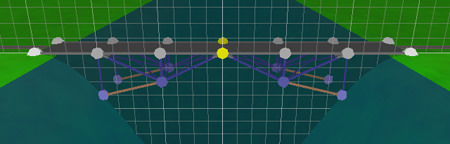 Ceci indique au jeu où 'ouvrir' votre pont mobile. Ajoutons maintenant les vérins hydrauliques pour cela. Sélectionnez 'Hydralc' et construises deux jeux de poutres pour relever les deux parties centrales du tablier. Reliez une extrémité au point jaune de joint et l'autre à votre support de chaque côté, comme ceci:
